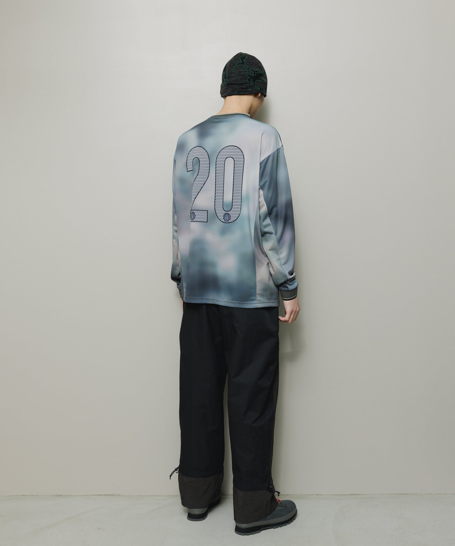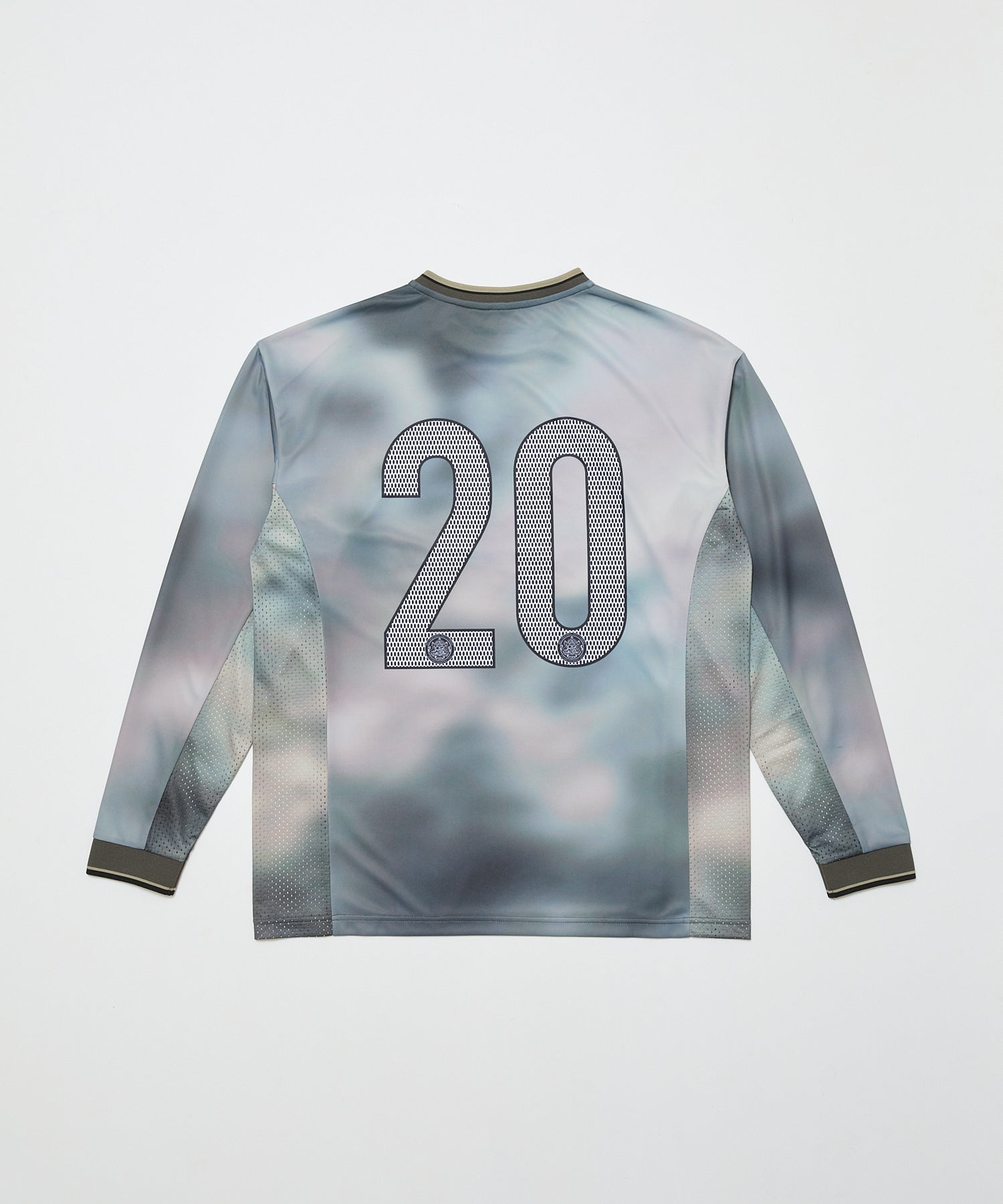 ロングスリーブ。オリジナルグラフィックプリントテキスタイルとナンバリングプリント。吸水速乾機能のポリエステル素材。