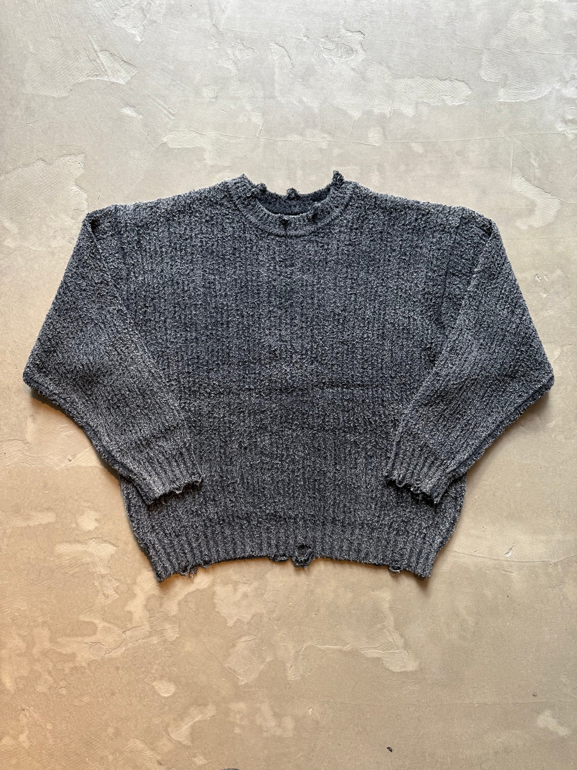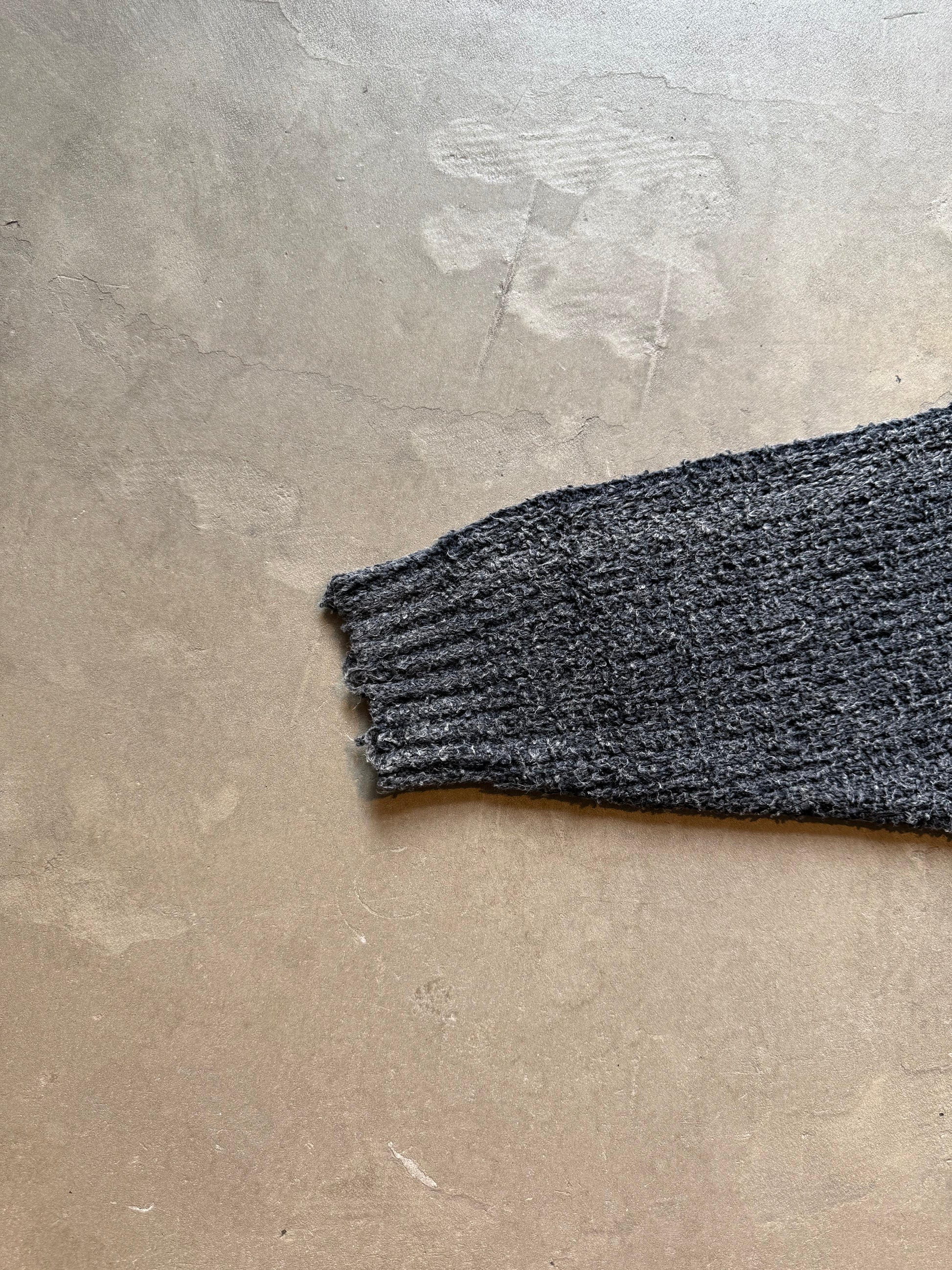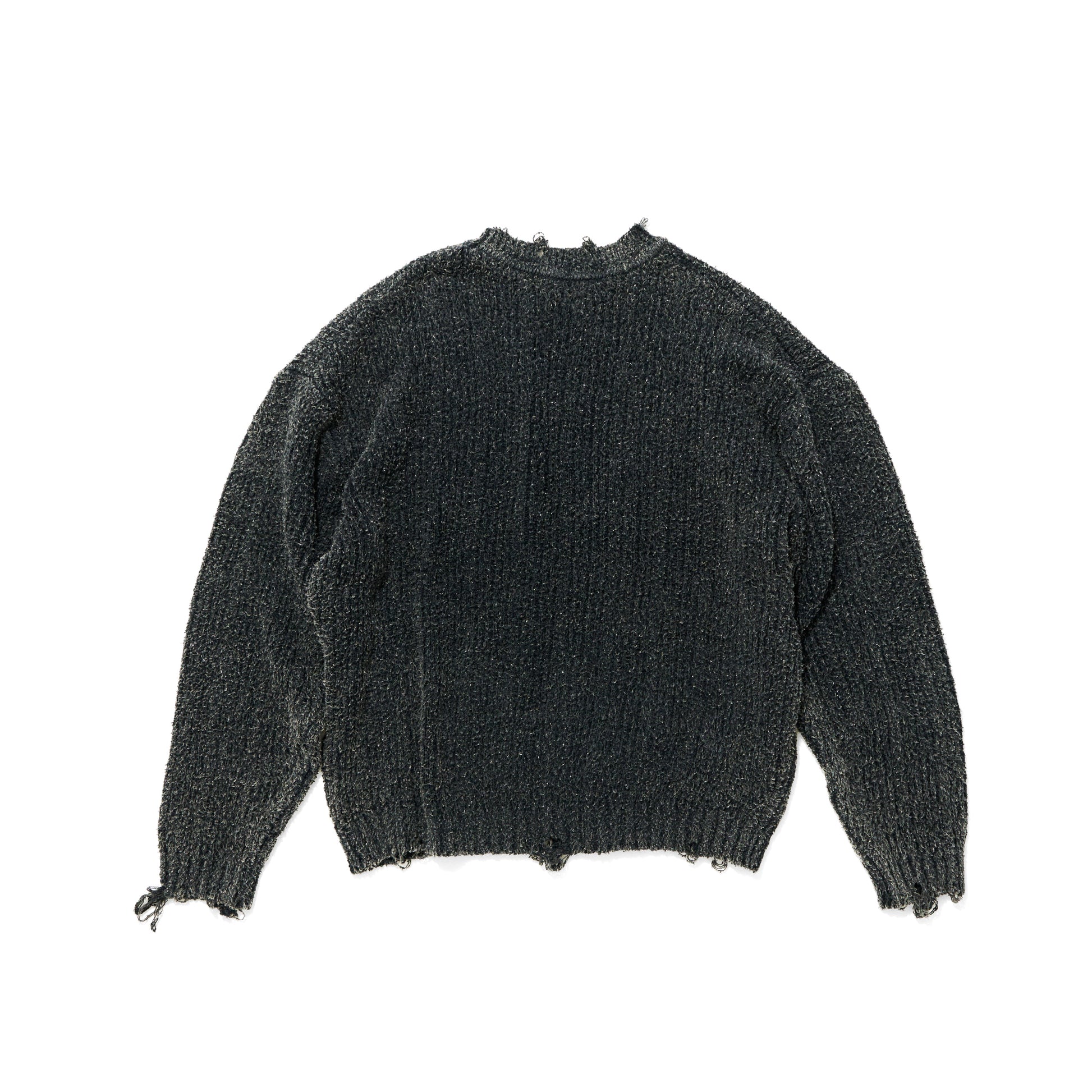 生地を編む段階でダメージ加工を施し、製品を染め上げた後に更に洗いをかけることでユーズド感を出しつつも高級感のある1着に仕上げております。